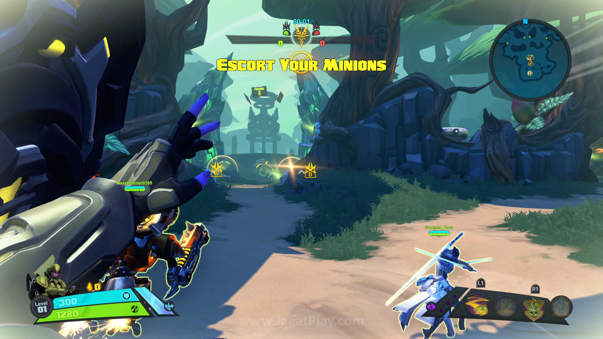 Pertama, soal framerate. Anda yang cukup sering membaca JagatPlay tentu memahami bahwa kami bukanlah media yang cukup peduli soal framerate, apalagi jika mencicipi sebuah game multiplatform di konsol yang notabene punya performa lebih rendah daripada PC. Selama ia bisa mencapai 30fps secara stabil, tak ada yang pantas untuk dikeluhkan. Namun tidak untuk Battleborn ini. Walaupun ia berhasil mencapai framerate yang cukup stabil – 30fps selama masa beta ini di versi Playstation 4, sulit untuk mengesampingkan keinginan untuk mencicipi game ini setidaknya di 60fps. Untuk sebuah game yang tak punya kualitas visual yang bisa dibilang menawan dan gameplay yang butuh banyak presisi eksekusi skill atau tembakan, 30fps adalah sebuah standar yang sulit untuk ditoleransi. Selalu ada rasa tidak puas dan harapan untuk menikmati game seperti ini di framerate lebih tinggi walaupun harus mengorbankan visual atau resolusi sekalipun. Jika Overwatch dan Call of Duty Multiplayer bisa melakukannya, kenapa mereka tidak?