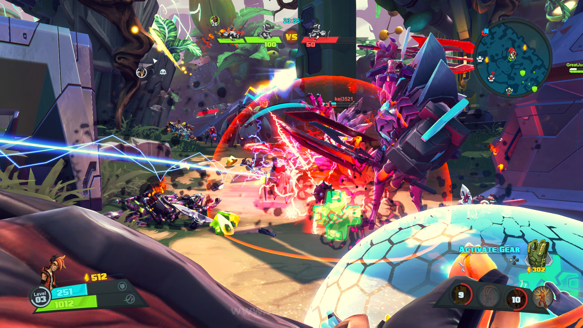 Keempat, sistem serangan melee. Seperti yang kita tahu, karakter di Battleborn dibagi ke dalam dua varian besar – melee dan range. Melee tentu saja hadir dengan serangan jarak dekat yang mengharuskan Anda untuk mendekati musuh Anda dan menyerang, sementara range bisa melakukan segala sesuatunya dari jarak jauh walaupun biasanya hadir dengan range damage yang lebih rendah. Secara garis besar, konsep ini adalah sesuatu yang sudah sering Anda temukan di MOBA. Berita buruknya? Sensasi serangan melee-nya benar-benar buruk. Mendekati musuh, creep ataupun karakter lawan dan mengayunkan senjata melee Anda tak memberikan feedback yang nyata apakah serangan Anda sebenarnya masuk atau tidak. Belum lagi dengan FOV yang begitu sempit, begitu musuh mulai melompat, Anda biasanya sudah akan kehilangan arah kemana mereka dan berakhir jadi serangan membabi buta. Solusi kami? Seperti SMITE, Opsi karakter third person untuk karakter melee akan jadi opsi yang bagus.